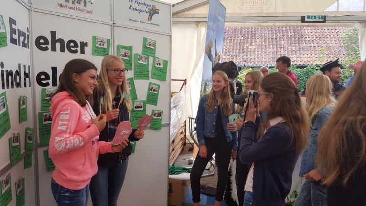 Unsere eigenen Auszubildenden sind diejenigen, welche die jugendlichen Messeteilnehmer zu einem Foto an unserem Messestand animieren und das Ganze auch in die Tat umsetzen.