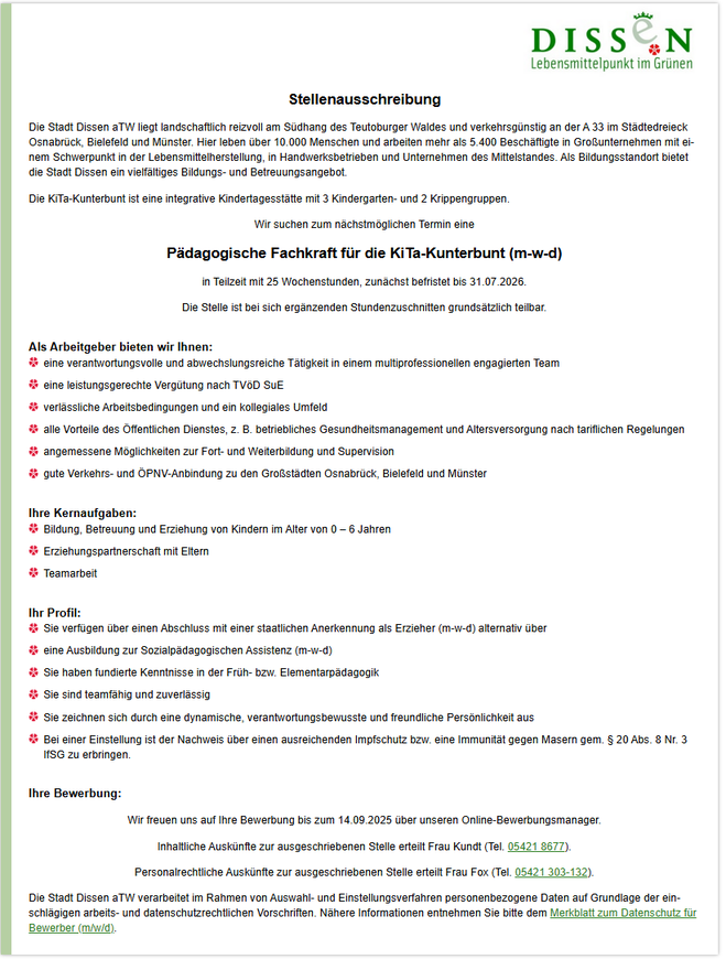 Sie gestalten den Alltag der Kinder und ermöglichen ein glückliches und selbstbestimmtes Heranwachsen. Ihr Beitrag zur Erziehung und Bildung unterstützt und fördert nicht nur die Kinder selbst, sondern auch die Vereinbarkeit von Familie und Beruf der Eltern.